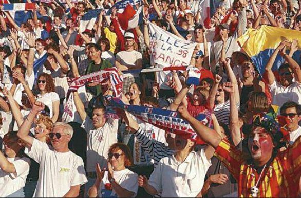 In our second picture, fans in a French stadium cheer wildly at their team's victory in a soccer match. Among all nationalities, ethnic groups, and races – among everyone today – the general tendency is to think that this is happiness.