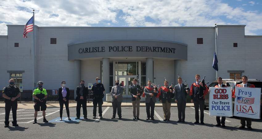 Instead of resting, the volunteers went first to the Carlisle police station with St. Michael’s medals and five sets of bagpipes to show their appreciation for the often forgotten defenders of order. The young men walked into the building as the officers were receiving a Chick-Fil-A delivery, and pleasantly surprised them with the powerful medals of St. Michael and a short bagpipe concert.