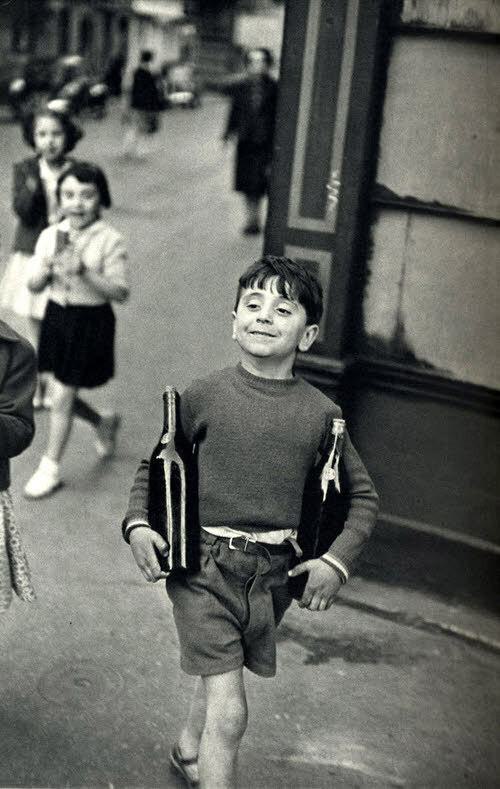 This candid shot was taken in Moufetard Street in Paris. Walking home, a boy caries two bottles, providing for two pleasant days – Saturday and Sunday.