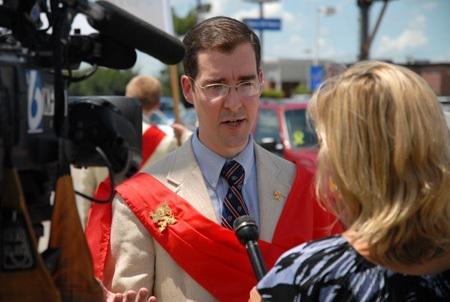 The TFP campaign was very visible. We have a large banner and it reads: "May God protect America from socialism." Smaller posters invite passing vehicles to "Honk for true freedom from socialism." So, as you can imagine, what typically happens is this: as soon as the traffic light turns green a symphonic erruption of honking horns begins. Then there is our bagpiper playing patriotic music which attracts yet further attention. That explains why a news crew with Channel 6 that happened to be driving by pulled over and filmed the campaign. I'm pretty sure they showed a segment of our campaign on the 5 or 6 oclock news.
