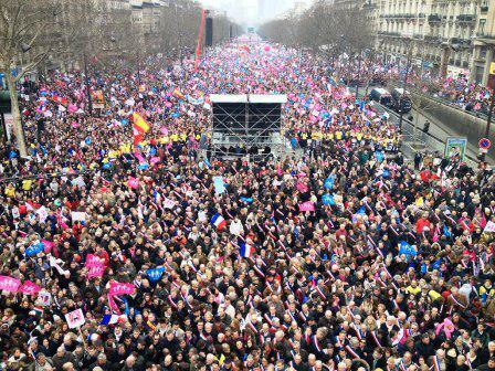 From every region of France, over 1.4 million people gathered in Paris on Sunday to oppose same-sex "marriage" and homosexual adoption. The pro-family movement has been growing ever since France's National Assembly passed a pro-homosexual "marriage" bill, which will be voted on in the Senate early next month.