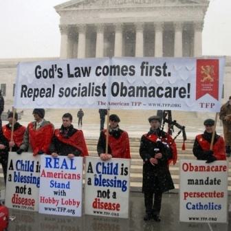 And today, as their case was heard at the Supreme Court, pro-lifers and conservative leaders and activists prayed and rallied to support the Green family for upholding their moral principles. TFP Student Action volunteers played bagpipes and held a banner, “God’s Law Comes First – Repeal Socialist Obamacare,” as well as signs such as “Real Americans Support Hobby Lobby!”