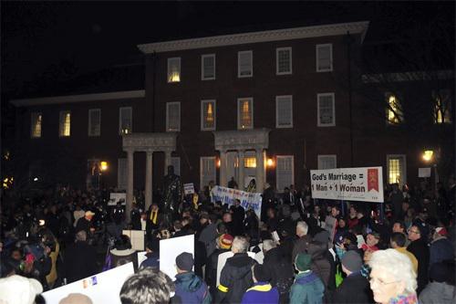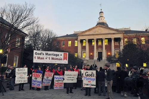 Thousands of traditional marriage supporters held a rally at the Maryland Statehouse in Annapolis on Monday, January 30, to oppose the recent push by the Governor and State Legislature to legalize same-sex "marriage." Between speeches, the lively crowd chanted, "one man, one woman" and "kill the bill" and "Adam and Eve: YES! Adam and Steve: NO!"