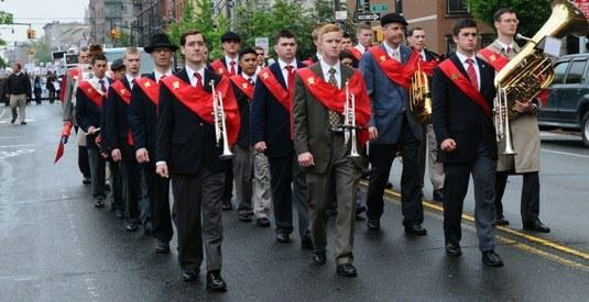 Under a light drizzle, we disembarked at 149th St and 3rd Ave and assembled the Holy Choirs of Angels Corps marching band. Invited to lead off the march, we positioned ourselves accordingly. Soon, thousands of traditional marriage supporters surged forward to the sound of God Bless America, holding signs that read: “Adam & Eve = Family,” and “Don’t Change Marriage.”