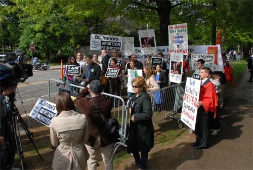 Approximately fifty faithful Catholics protested outside the Beacon Street entrance of Boston College on Monday morning as Mr. Kenny took to the podium. The peaceful rally and press conference was organized by Students for Life and supported by the Catholic Action League of Massachusetts, Operation Rescue (Boston) and local pro-life leaders.