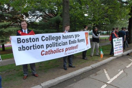 A contingent of volunteers from TFP Student Action also participated, bringing large signs, a 14-foot banner, TFP standard, American flag, bagpipes and drums. The TFP banner and signs read: “Boston College honors pro-abortion politician Enda Kenny. Catholics Protest!” and "Real Catholics never promote abortion."