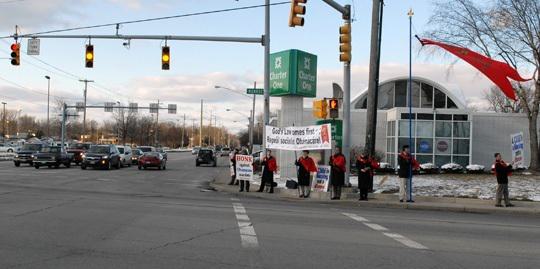 Our first stop was at the University of Toledo. However, the extreme paucity of students prompted us to relocate to a better location. That determination brought us to a busy road in Toledo. Frigid temperatures did not deter us and a brisk pace of honking against Obamacare kept up for the whole campaign.