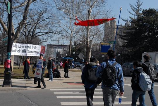 As the campaign continued, support and opposition intensified. One student, after reading our flier, returned to thank us and ask how he can get involved in the fight against Obamacare. Another student pointed out how Catholics are being targeted: "I don't think the federal government would force mosques to serve bacon," he said.