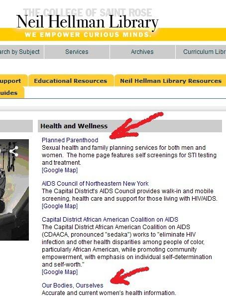In fact, Planned Parenthood is listed twice by the college, once under "health and wellness" and again under "ask a nurse practitioner." Another radical pro-abortion group called Our Bodies, Ourselves is also listed.