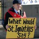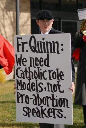 After a blessing and a resounding send-off by the TFP band, the rally dispersed. For us, however, the day was not yet complete. Measured by a steady drum beat, we marched from the cathedral to Brennan Hall, where the pro-abortion speakers were being given a forum. Forming up outside on the green -- with the permission of the campus police -- we held signs: "What would St. Ignatius Say?" and "Fr. Quinn: We need Catholic role models, not pro-abortion speakers" and "Thank you Bishop Bambera."