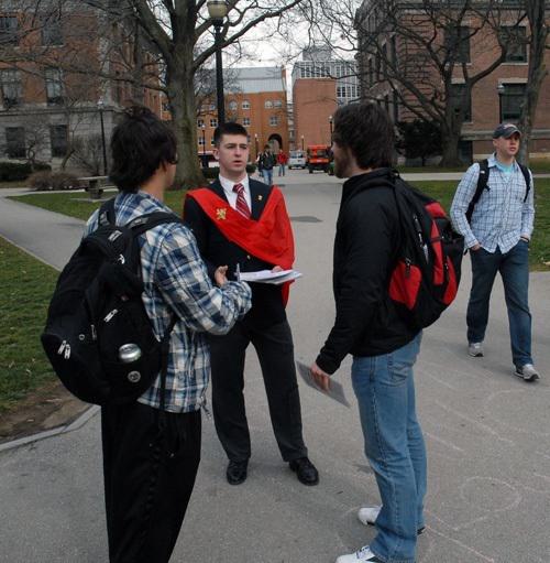 Arising early on Friday, we prepared for what we knew would be the most intense campaign yet: The Oval, right in the very heart of Ohio State University. Raising the TFP standard and unrolling our banner, we immediately met students who voiced their support or opposition. Our bagpipes once again echoed with distinction, serving to attract attention and draw crowds from across the sprawling campus, which has a huge enrollment of over 52,000 students. As one passer-by remarked: "Wow! Those bagpipes have been playing all morning!" Many others paused to take pictures of our banner or film the bagpipers with their phones.