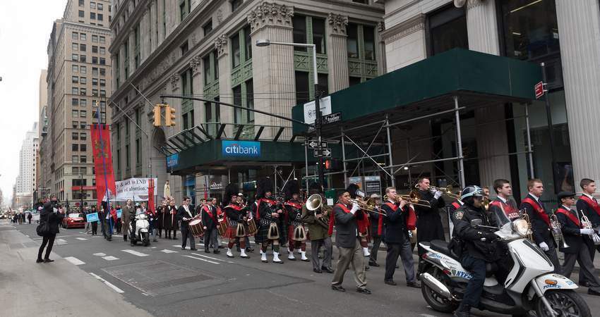 The march itself began at Foley Square and passed by iconic landmarks of the city such as Ground Zero and the Wall Street Charging Bull. At the head of the march was a sight not unfamiliar to those who attend the annual March for Life in Washington D.C., the TFP band, its crimson standards and a statue of Our Lady of Fatima carried by an honor guard wearing the TFP habit. Behind them were banners, which displayed messages such as “Pray and Act to End the Sin of Abortion” and “a Child, not a Choice.”