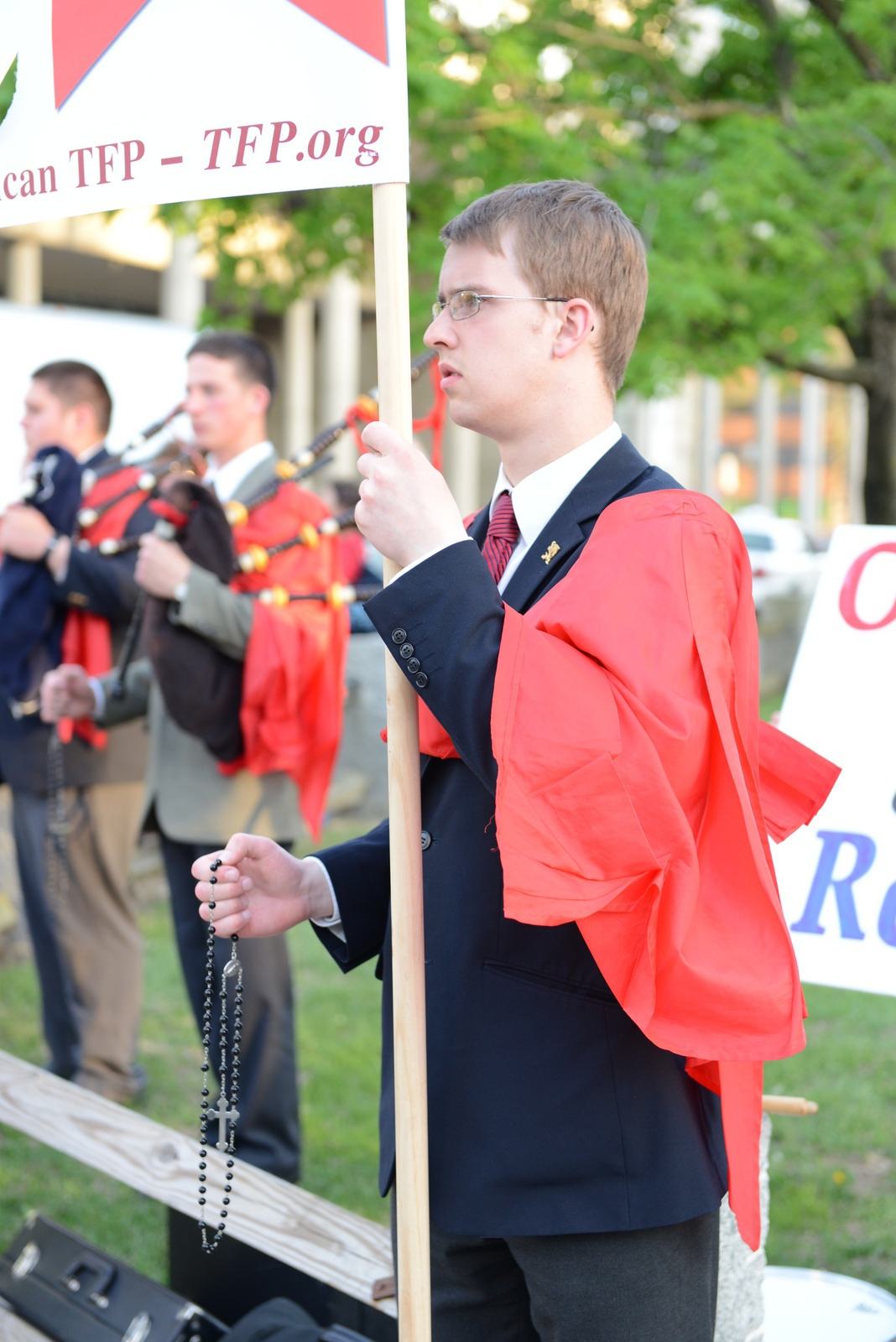 The protest featured the recitation of the Rosary, the prayer to Saint Michael the Archangel and hymns to the Blessed Virgin Mary, whose image was present under the invocation of Our Lady of Fatima, escorted by four members wearing the TFP ceremonial habit. America Needs Fatima volunteers held a banner behind Our Lady and students of Saint Louis de Montfort Academy played bagpipe renditions of God bless America, Immaculate Mary and Hail Holy Queen Enthroned Above.