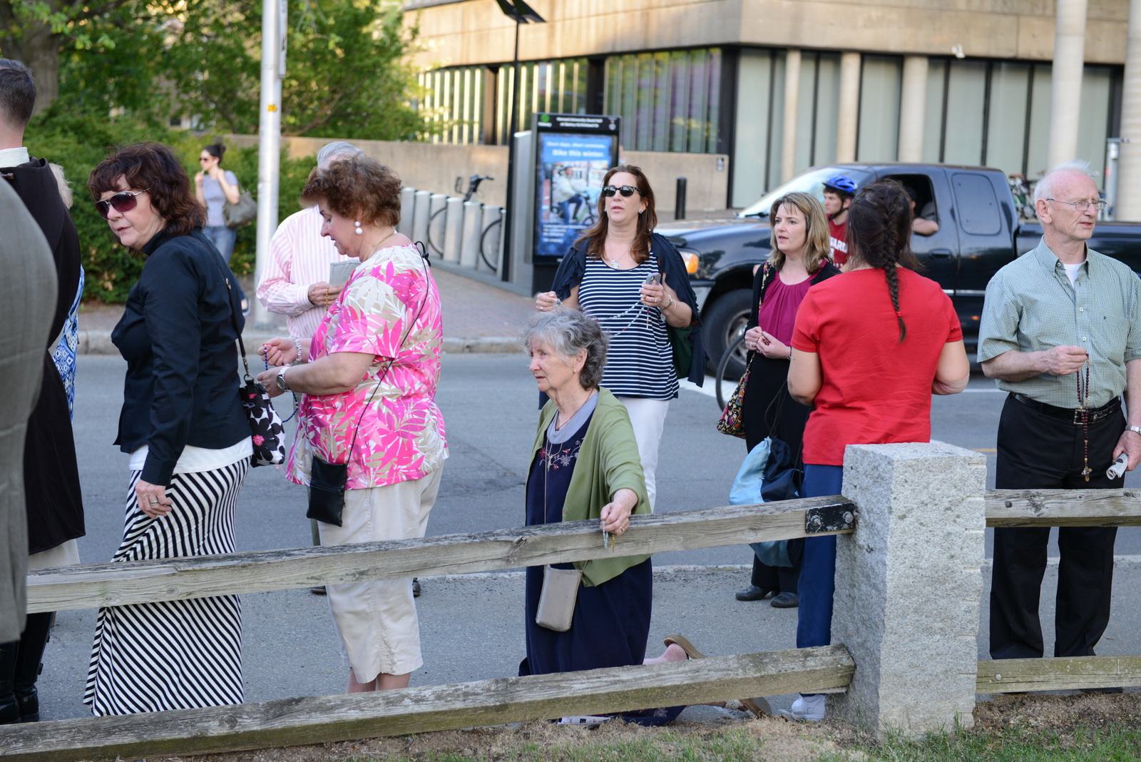 Since the spiritual battle between good and evil has never been more visible, Saint Michael, Captain of the Angelic Hosts, was invoked repeatedly over the bullhorn. As we prayed, a group of individuals dressed mostly in black with satanic insignia gathered in little groups to jeer and mock the prayers. One even muttered "Hail Satan!" as he passed by the statue of Our Lady of Fatima. But this did not in the least deter those on the sidewalk who continued praying the Rosary at the intersection of Cambridge and Kirkland streets until 8:35 PM.
