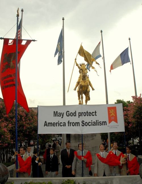 Today we got up at 6:30AM to get a good early start. We traveled in two vehicles to St. Patrick’s Church in downtown New Orleans, picking up several caravan participants on the way. After a delicious pizza lunch courtesy of a TFP supporter who met us at the church hall, we headed out to find a place for campaign. Arriving at the junction of Clearview Parkway and Veterans Blvd. at 2:30 with 17 volunteers we began our first campaign. The response was reasonably good. We displayed a large American flag, one TFP standard, two small standards, signs, and a three-man banner, reading: “May God protect America from socialism.”